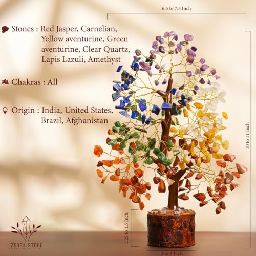 ELEGANT 7 CHAKRA CRYSTAL TREE (10-12 INCH) — SPIRITUAL CENTERPIECE Handcrafted with genuine chakra stones (Red Jasper, Carnelian, Yellow Aventurine, Green Aventurine, Lapis Lazuli, Amethyst, Clear Quartz) on golden metal wire. Perfect for living rooms, offices, or meditation spaces.